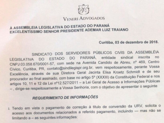 O SINDILEGIS/PR, através da sua assessoria jurídica, DR. Marcelo Veneri, REQUER ao Presidente da Alep, informações a respeito do pagamento da correção da Unidade Real de Valor (URV), no dia 03 de dezembro, após várias ligações a entidade questionando o critério de pagamentos aos servidores. A Assessoria está buscando soluções para informar melhor os servidores .Não restam dúvidas acerca da violação dos direitos subjetivos destes servidores públicos, sendo nítida a transgressão do preceito constitucional da irredutibilidade de vencimentos, insculpido no artigo 37, XV da CF/88, vez que, dada a sua natureza cogente, sua edição veio estabelecer padrão igualitário justamente para que nenhum cidadão brasileiro viesse a ser prejudicado, não comportando nenhuma hipótese de exceção.