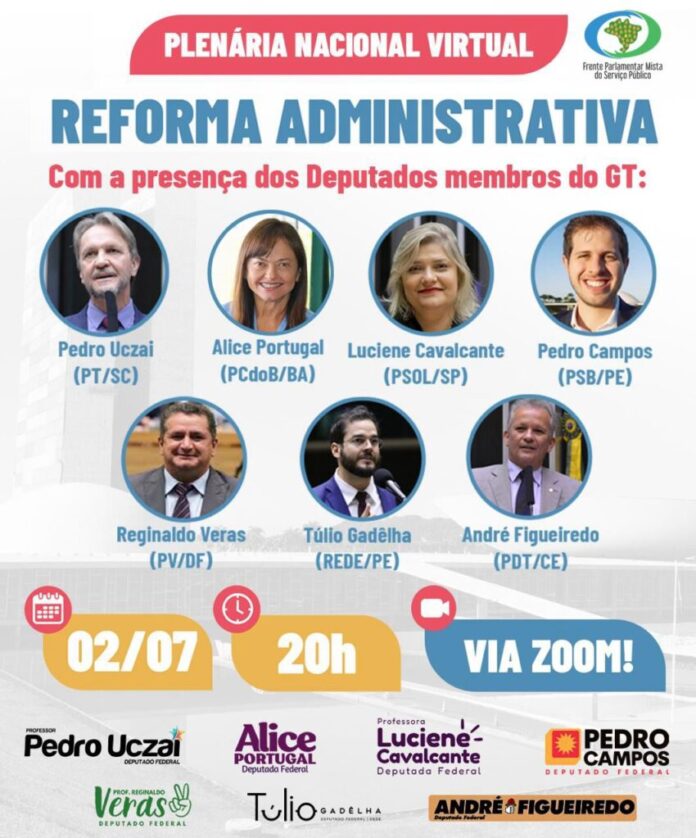 A Frente Parlamentar Mista do Serviço Público realizará na próxima quarta-feira, 2 de julho, uma plenária virtual para debater os impactos da Reforma Administrativa. O evento, marcado para às 20h via plataforma Zoom, reunirá parlamentares e representantes do funcionalismo público para discutir estratégias de resistência às mudanças propostas.