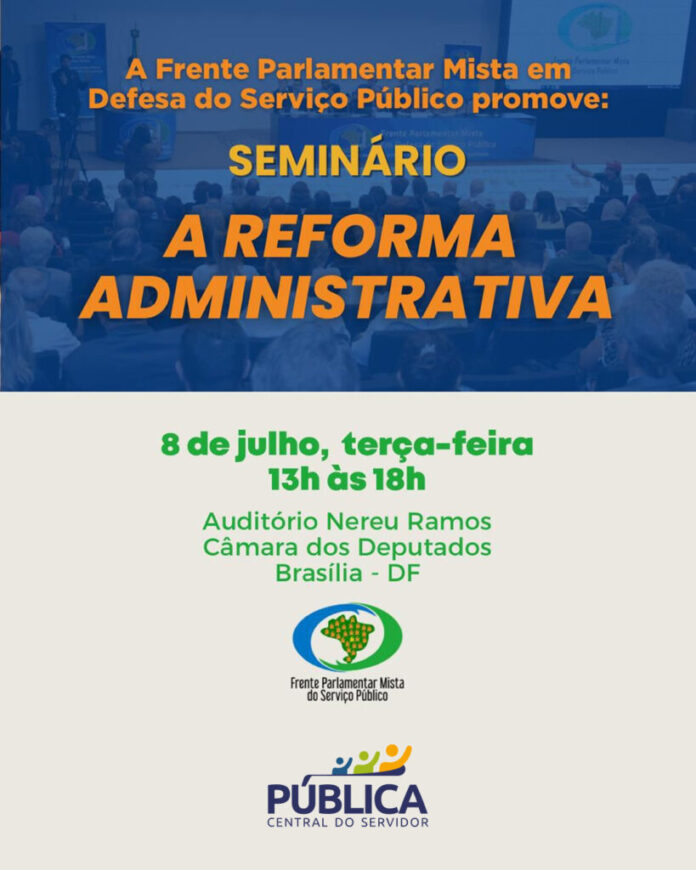 A Frente Parlamentar Mista do Serviço Público realizará na próxima terça-feira, 8 de julho, o seminário “A Reforma Administrativa”. O evento acontecerá no Auditório Nereu Ramos da Câmara dos Deputados, das 13h às 18h, e contará com a participação de suas entidades parceiras. A Pública Central do Servidor estará representada por seus diretores e entidades filiadas.